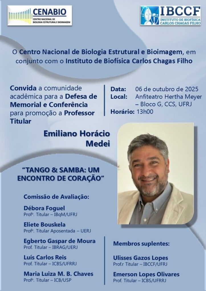 O CENABIO, em conjunto com o Instituto de Biofísica Carlos Chagas Filho – IBCCF convidam a comunidade acadêmica para a Defesa de Memorial e Conferência para promoção a Titular do prof. Emiliano Medei.